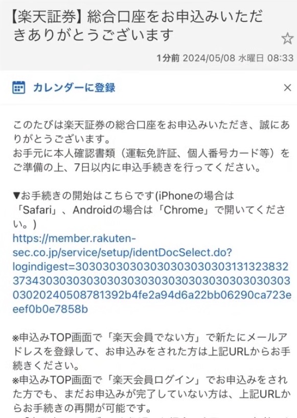 楽天での審査完了後、早ければ翌営業日に楽天証券へのログインIDがメールで届きます。