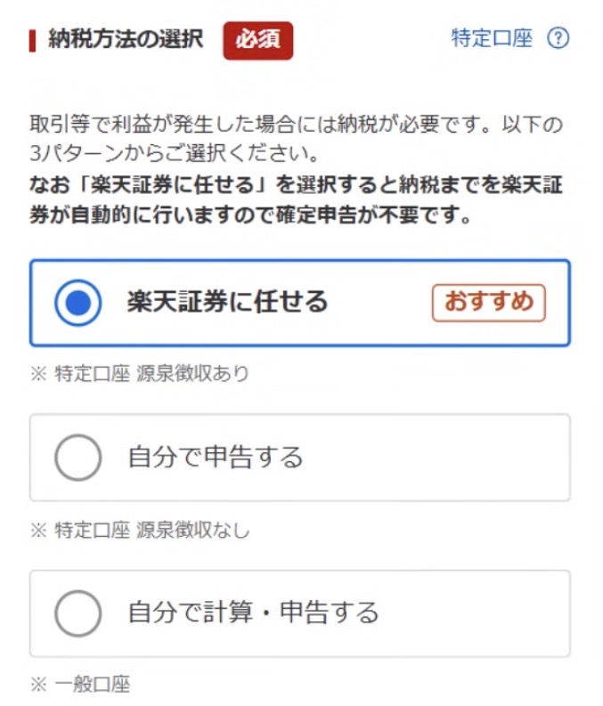 株の売買等で利益が出た場合は納税が必要になりますが、上記を選択すれば売買時に楽天側で自動徴収してくれるため確定申告は不要になります。
