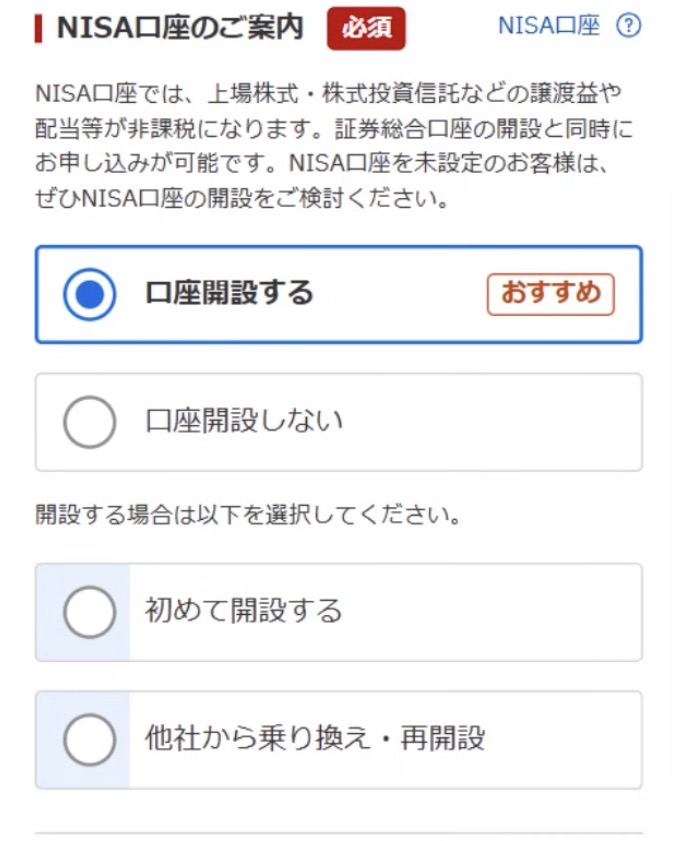 NISA口座はひとり1口座までなので、他の金融機関で開設済みの場合は「他社から乗り換え・再開設」を選択すればOKです。