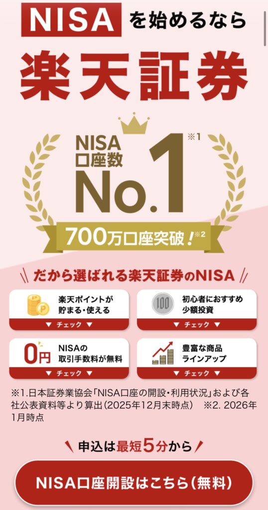 楽天証券へアクセスし、「NISA口座開設はこちら(無料)」をタップします。